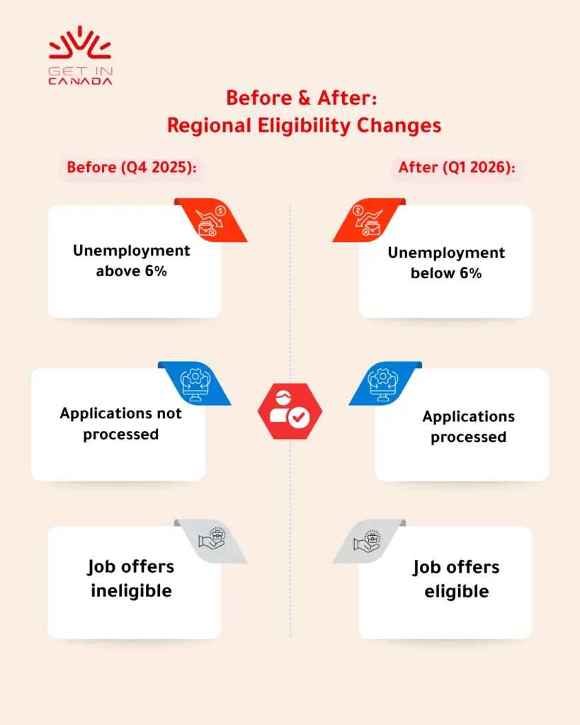 - Low-wage LMIA processing has resumed in 8 regions starting January 9, 2026, as unemployment rates fell below 6%.