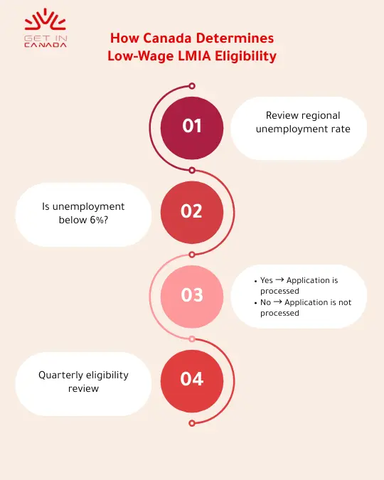 In August 2024, the government announced it would stop processing low-wage LMIA applications in CMAs with unemployment 6% or higher to encourage employers to hire eligible local workers.